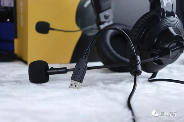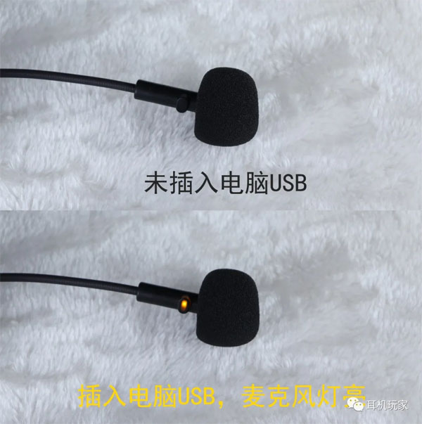 麥克風(fēng),和傳統(tǒng)電腦耳麥類似,置于耳機左側(cè),可以上下擺動到自己合適的角度,內(nèi)部軟性金屬可以自由調(diào)節(jié)靠近口部的距離。同時,在耳機插入電腦USB后,麥克風(fēng)上的小黃燈就會亮起,表示開始待命。