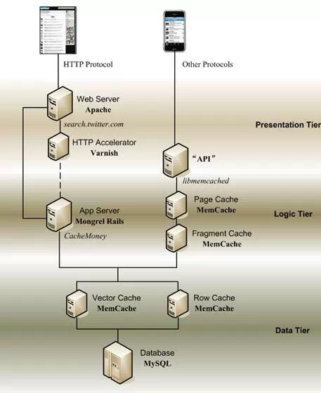 訪問twitter的用戶除了網(wǎng)頁(web通道),還有手機(jī)(API通道),而后者的比例占總流量的80%-90%。mysql cache之外,cache的重心會在API通道上。手機(jī)屏幕的主體,是一屏一屏的消息,不妨把整個(gè)頁面分割成若干局部,每個(gè)局部對應(yīng)一些/一條消息,這些就是fragment。人氣高的作者,緩存其頁面的fragment,可以提高讀取其發(fā)布消息效率,這就是fragment cache的使命。人氣旺的作者,人們也會訪問其主頁,這就是page cache的使命。實(shí)際結(jié)果,fragment cache的命中率為95%,page cache為40%。雖然page cache的命中率低,但由于是訪問主頁,其占用的空間是很大的,為了防止兩種cache相互影響,這兩種cache需要部署在不同的物理機(jī)器上。twitter的fragment cache和page cache都是使用的memcached。