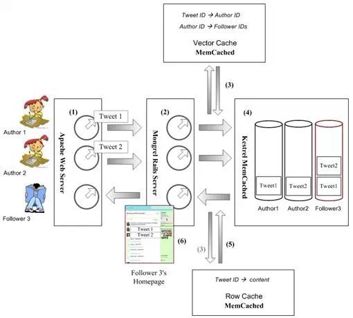 (5)某一臺Mongrel,它可能正在處理某一個(gè)id的隊(duì)列,就會往返回該id用戶的主頁上添加上此條信息;(6)Mongrel將更新后作者的主頁給前端等待著的apache,apache則返回瀏覽器。
