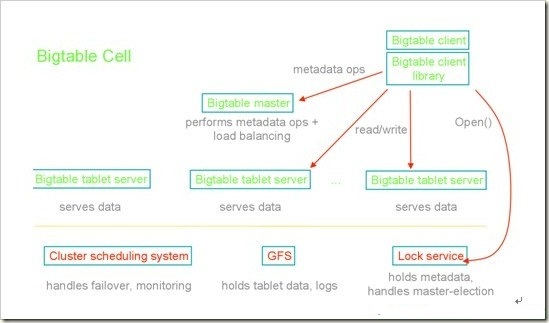 BigTable是基于GFS和MapReduce之上的,那么google既然已經(jīng)有了GFS,為何還要有BigTable呢(也是我原先的一個(gè)疑問)?后來想想這和已經(jīng)有操作系統(tǒng)文件系統(tǒng)為何還要有SQL SERVER數(shù)據(jù)庫(kù)一樣的道理,GFS是更底層的文件系統(tǒng),而BigTable建立在其上面,不僅可以存儲(chǔ)結(jié)構(gòu)化的數(shù)據(jù),而且可以更好的管理和做出負(fù)載均衡決策。