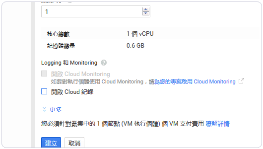 7、Google Cloud Platform亞洲節(jié)點(diǎn)貌似是位于臺(tái)灣,連接國(guó)內(nèi)的速度比較快。然后就是選擇主機(jī)的配置,最小的是1個(gè)CPU,0.6GB內(nèi)存。