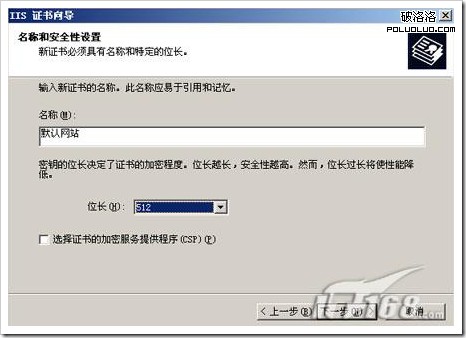 第七步:設置證書的名稱和特定位長,名稱保持默認網(wǎng)站即可,在位長處我們通過下拉菜單選擇512。