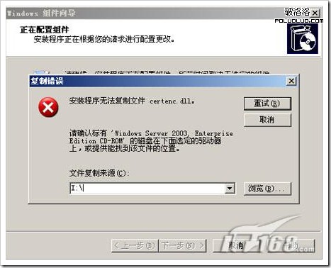 第十步:安裝過程中會出現(xiàn)缺少文件的提示,我們需要將windows2003系統(tǒng)光盤插入光驅中才能繼續(xù)。