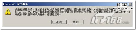 第四步:系統(tǒng)會彈出“安裝證書服務后計算機名和區(qū)域成員身份會出現(xiàn)改變,是否繼續(xù)”的提示,我們選“是”即可。