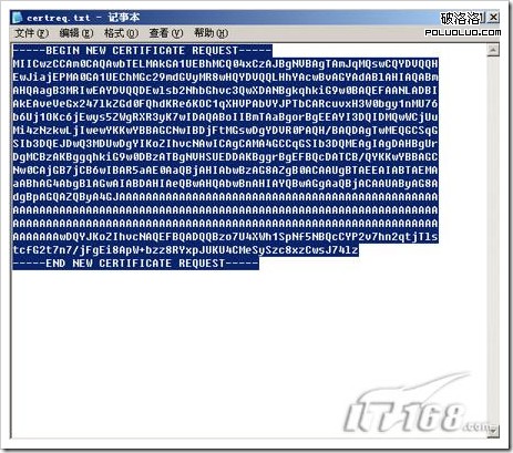 第五步:用記事本打開上面保存在桌面上的那個certreq.txt文件,將里面的內(nèi)容全部復制。