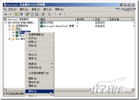 第二步:在默認網(wǎng)站上點鼠標右鍵選擇“屬性”。