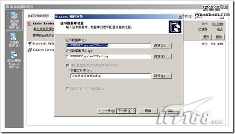 第七步:輸入證書數(shù)據(jù)庫等信息的保存路徑,仍然選擇默認位置系統(tǒng)目錄的system32下的certlog即可。