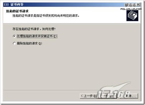 第二步:掛起的證書請求窗口中選擇“處理掛起的請求并安裝證書”選項。