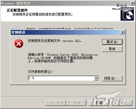 第十步:安裝過程中會出現(xiàn)缺少文件的提示,我們需要將windows2003系統(tǒng)光盤插入光驅(qū)中才能繼續(xù)。(如圖9)