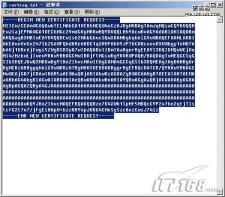 第五步:用記事本打開上面保存在桌面上的那個certreq.txt文件,將里面的內(nèi)容全部復制。(如圖25)