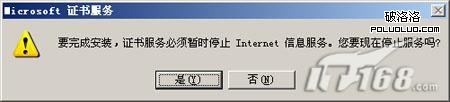 第八步:下一步后出現(xiàn)“要完成安裝,證書服務必須暫時停止IIS服務”的提示。選擇“是”后繼續(xù)。(如圖7)