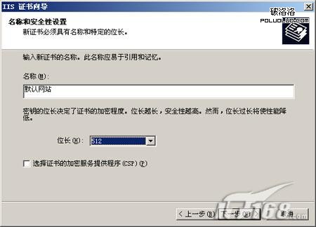 第七步:設置證書的名稱和特定位長,名稱保持默認網(wǎng)站即可,在位長處我們通過下拉菜單選擇512。(如圖16)