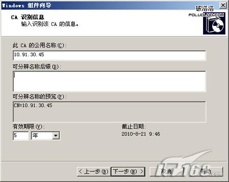 第六步:CA識別信息處的CA公用名稱輸入本地計算機的IP地址,如10.91.30.45,其他設置保留默認信息即可。(如圖5)