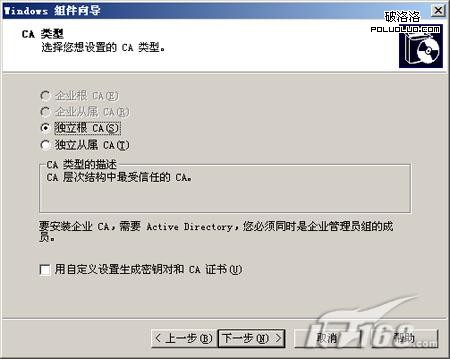 第五步:在windows組件向?qū)A類型設置窗口中選擇獨立根CA。(如圖4)