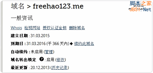 2、點(diǎn)擊域名,可以進(jìn)入到域名的管理面板中,這里可以看到域名的到期時(shí)間、Whois、域名轉(zhuǎn)出鎖定等等。