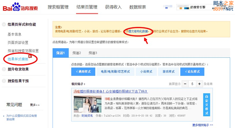 開通方法是:在百度站內(nèi)搜索后臺提交結(jié)構(gòu)化數(shù)據(jù),提交入口在“結(jié)果頁管理à結(jié)果樣式模板”頁面的最上方(下圖紅色箭頭位置):
