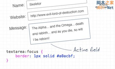 可以使用“focus”展現(xiàn)選中的文本區(qū)域處于動(dòng)態(tài)中。也可以使用CSS樣式,例如,突出的邊框或者略有變化的背景色。