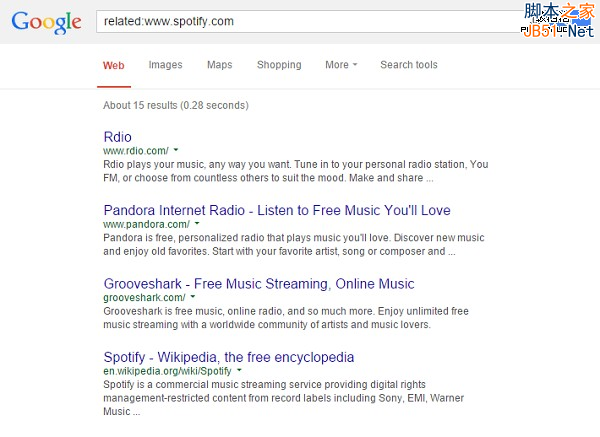 與site命令不同,related命令可以幫助你找到某個(gè)類似的站點(diǎn)。上面就是以流媒體音樂(lè)服務(wù)網(wǎng)站Spotify作為例子進(jìn)行的搜索(related:www.spotify.com),結(jié)果出現(xiàn)了Rdio、Panadora和Grooveshark等同類網(wǎng)站。