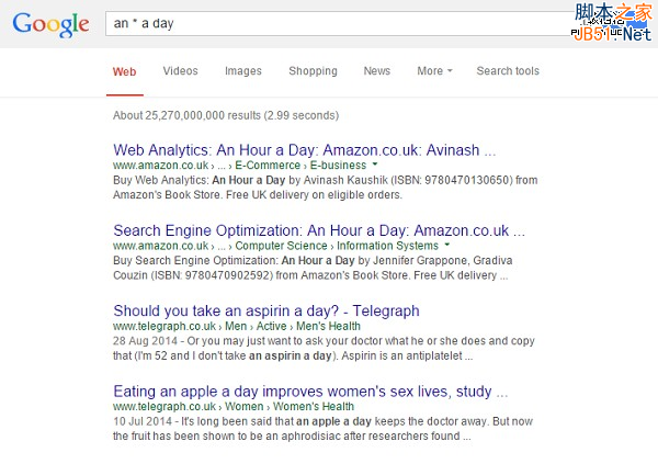舉例來(lái)說(shuō),如果你忘了“an apple a day”中的“apple”,那么用通配符“*”帶代替它進(jìn)行搜索即可。