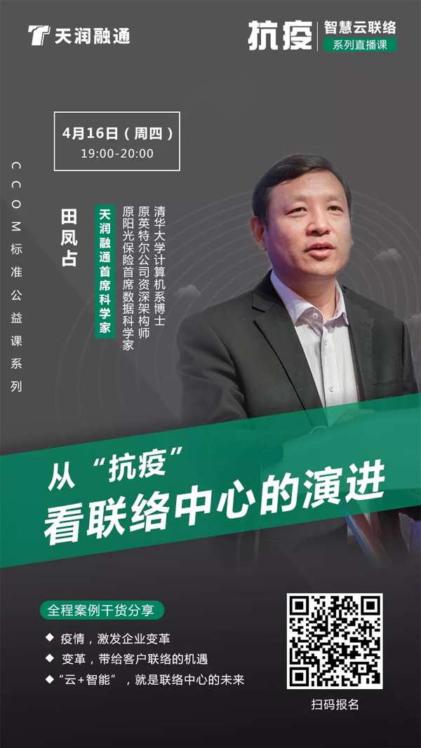 天潤融通賦能多家企業(yè)聯(lián)絡中心云化和智能化,“抗疫”而上。4月16日(周四)19:00,易訓(中國)管理研究院聯(lián)合天潤融通共同舉辦【從“抗疫”看聯(lián)絡中心的演進】公益課,和大家分享疫情給客戶聯(lián)絡帶來的機遇、智慧云聯(lián)絡中心“抗疫”案例。