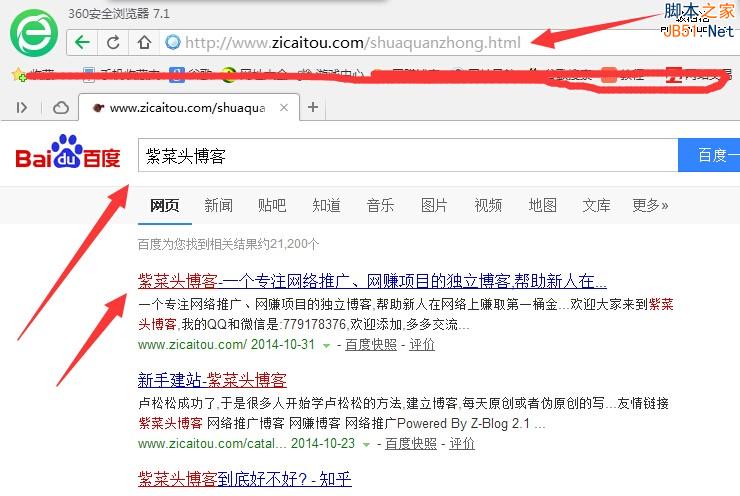 可以發(fā)現(xiàn),點(diǎn)開這個鏈接就是模擬的百度搜索“紫菜頭博客”這個關(guān)鍵詞。達(dá)到了我們模擬百度搜索關(guān)鍵詞的目的。