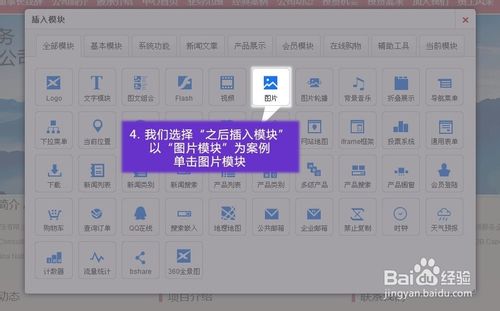 添加網(wǎng)站模塊——鼠標(biāo)雙擊“空白區(qū)域",再找到適當(dāng)?shù)膮^(qū)域,點(diǎn)擊“雙擊這里添加模塊”——我們已“圖片”模塊為案例展示如何添加新模塊——選擇喜愛(ài)的圖片后點(diǎn)擊“確認(rèn)”,即可成功添加新模塊。