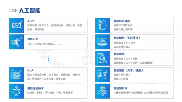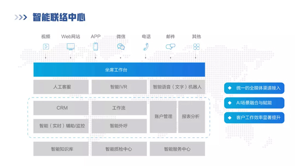 智能聯(lián)絡(luò)中心的全媒體接入能力,使得客服人員可以在一個(gè)界面中并發(fā)處理電話(huà)、網(wǎng)站、微信、APP等來(lái)源的客戶(hù)服務(wù)請(qǐng)求,大大提高了客戶(hù)服務(wù)的工作效率。加之AI技術(shù)如ASR、TTS、NLP技術(shù)的引入,實(shí)現(xiàn)自然語(yǔ)言的理解能力和處理能力,讓智能客服代替人工客服處理更多業(yè)務(wù),獲得服務(wù)標(biāo)準(zhǔn)化、統(tǒng)一化。