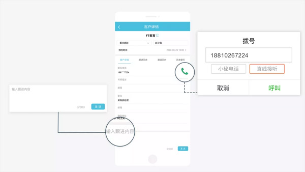 銷售人員可直接在手機上通過免費網(wǎng)絡(luò)電話和直線手機兩種外呼方式與客戶溝通,電話結(jié)束后可隨時在客戶里編輯最新資料,填寫跟進內(nèi)容,確保信息及時更新,同時每一通電話都會進行錄音,便于后期隨時查看。