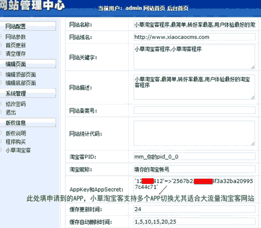 我們準備好1-2個空間,PHP、ASP都行,再準備一個域名,把小草淘寶客程序傳到空間就可以在后臺設置了。接下來就是把申請好的APP填入后臺,點確定即可,所有的網(wǎng)站圖片都是調(diào)用淘寶商品數(shù)據(jù)。如果你的網(wǎng)站流量非常大,就有必要使用多個淘寶APPKey。