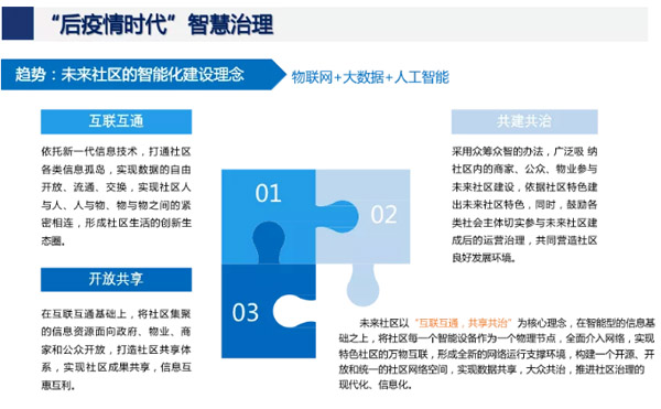 一場(chǎng)疫情,不僅加速了人工智能技術(shù)及應(yīng)用的廣泛落地,更引發(fā)了全球?qū)﹂L(zhǎng)期防疫機(jī)制和社會(huì)治理方式的思考。談到后疫情時(shí)代的社會(huì)治理,姚博以未來(lái)社區(qū)為例,指出未來(lái)社區(qū)兩大發(fā)展趨勢(shì):一是基于物聯(lián)網(wǎng)+大數(shù)據(jù)+人工智能,未來(lái)社區(qū)的智能化建設(shè)理念是“互聯(lián)互通,共享共治”;二是未來(lái)社區(qū)的建設(shè)目標(biāo)將以運(yùn)營(yíng)長(zhǎng)效化、感知智能化、數(shù)據(jù)管理化、服務(wù)在線化、運(yùn)營(yíng)節(jié)能化為核心。