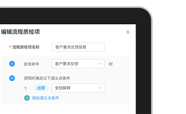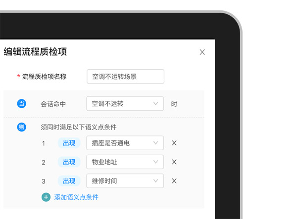“多條件”流程質(zhì)檢,指的是當客戶提到某個具體的場景,業(yè)務(wù)人員在回復(fù)中必須出現(xiàn)多個特定的語義點。