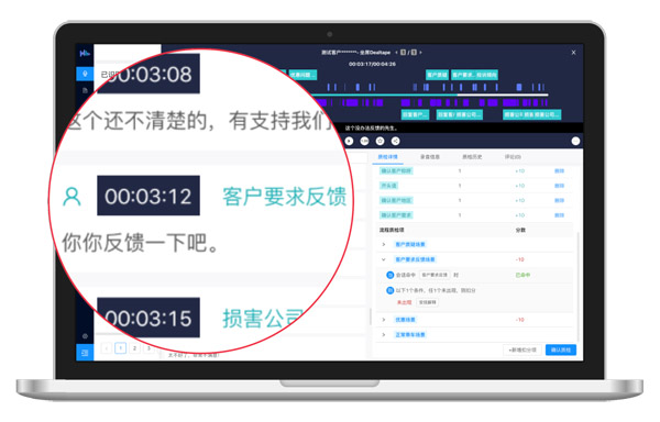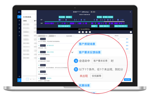 例如,很多企業(yè)的服務(wù)規(guī)范,要求業(yè)務(wù)人員遇到“客戶要求反饋”的場景時,及時作出“安撫解釋”。如果沒有出現(xiàn)“安撫解釋”的語義點,即判定該客服或銷售人員未按流程提供服務(wù),須減去一定的分值。