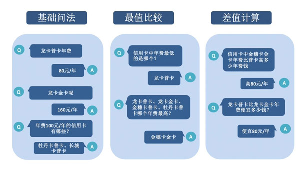 當(dāng)前百度智能客服的問(wèn)答可以支持基礎(chǔ)問(wèn)法、最值比較和差值計(jì)算三種問(wèn)法。當(dāng)再遇到“龍卡普卡比龍卡金卡年費(fèi)便宜多少”這類問(wèn)題時(shí),無(wú)需勞神,客服系統(tǒng)通過(guò)“差值計(jì)算”也能高效地直接給出答案:“便宜80元/年”。