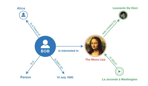 舉個(gè)例子,當(dāng)面對(duì)文本內(nèi)容”有個(gè)叫Bob的人,是Alice的朋友,他出生于1990年7月14日。Bob對(duì)達(dá)芬奇所畫的蒙娜麗莎畫作很感興趣,這個(gè)畫像畫的是來(lái)自華盛頓的Joconde的夫人”時(shí),就可以用知識(shí)圖譜來(lái)表現(xiàn)語(yǔ)義之間的關(guān)聯(lián)。
