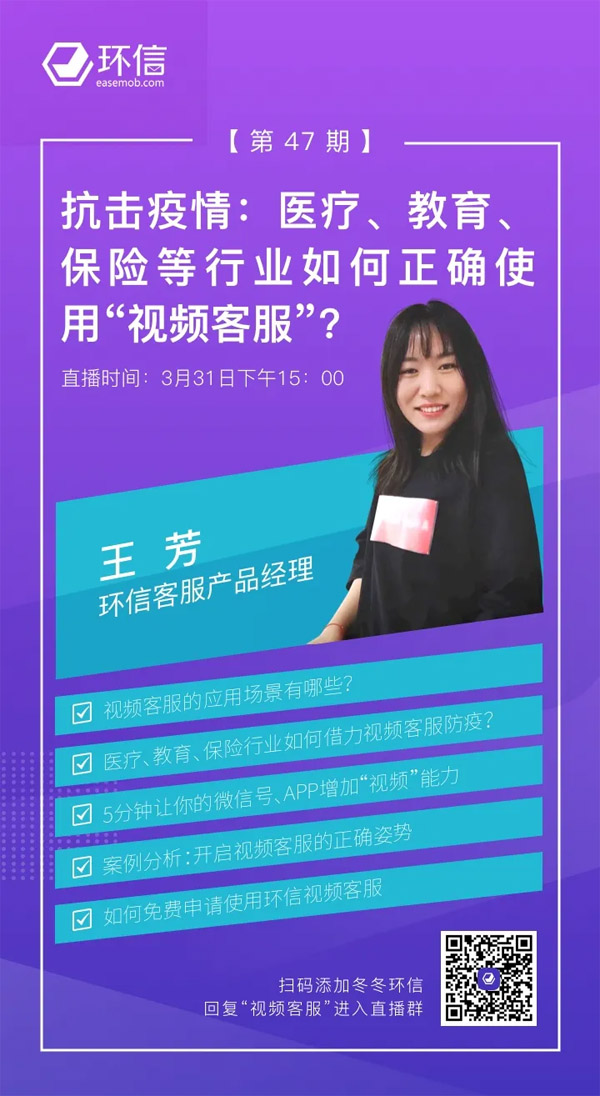 什么樣的防疫場景更適合使用“環(huán)信視頻客服”,效率更高?如何才能高效快速的集成環(huán)信視頻客服并應(yīng)用?各行各業(yè)如何通過視頻客服賦能快速恢復(fù)生產(chǎn)生活。3月31日(周二)下午15:00,環(huán)信線上直播公開課第47期,帶您解讀《抗擊疫情:醫(yī)療、教育、保險等行業(yè)如何正確使用“視頻客服”?》