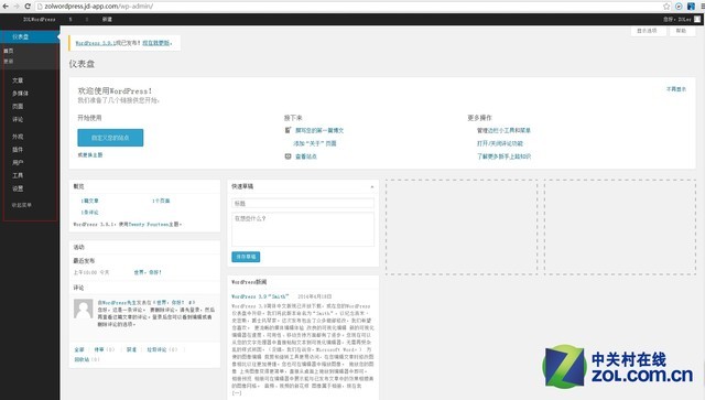 首先進入的是WordPress網(wǎng)站的控制臺,不過中文翻譯成了儀表盤……這里就不多吐槽了。可以看到左側(cè)一串按鈕可以實現(xiàn)WordPress網(wǎng)站的管理和優(yōu)化,而且你擁有最高的權(quán)限,想把這個網(wǎng)站建成什么樣子,做什么用,全由你自己說了算,是不是很Cool?