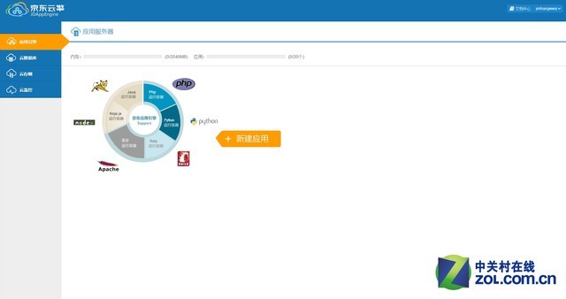 建立好數(shù)據(jù)庫之后,我們接下來要給WordPress一個運行環(huán)境,因此我們點擊左側(cè)菜單欄里的“應(yīng)用引擎”按鈕,進入應(yīng)用服務(wù)器控制臺,直接點擊“新建應(yīng)用”按鈕即可。