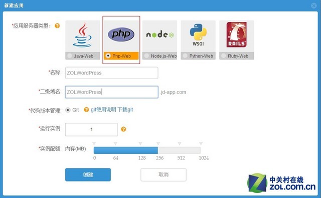 就筆者這幾天的試用來看,目前使用JAE搭建網(wǎng)站的人應(yīng)該不多,很多簡短的二級域名都能夠注冊,筆者為了方便大家理解,所以以“ZolWordPress”為名稱和二級域名,大家可以填寫的更加簡短以便于記憶。二級域名填好之后,你搭載的WordPress網(wǎng)站地址也就產(chǎn)生了,比如筆者的網(wǎng)站地址就是zolwordpress.jd-app.com,此外你還可以根據(jù)自身需求,調(diào)整下面的內(nèi)存配額參數(shù),其它都不用動就可以了。
