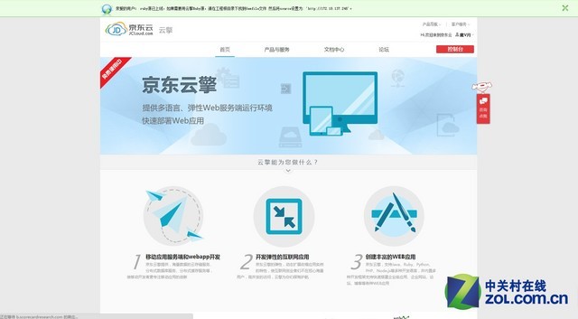 當你擁有京東云擎帳號之后,看到第一張圖右上角的控制臺按鈕了嗎?沒錯,什么也不要想的點進去就是了。京東云擎最大的優(yōu)點在于簡單易懂、童叟無欺,上面這張圖是第一次進入京東云擎時的頁面,是不是很簡單?絕對是學過拼音、學過漢字的小學生都能看懂的吧?