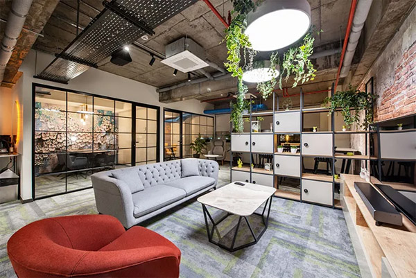 設(shè)計利用建筑本身所呈現(xiàn)的工業(yè)風(fēng)特色,采用暗調(diào)配色方案去強化這一空間特質(zhì)。裸露的頂面管道設(shè)施卻噴涂以靚麗的色彩,與各空間元素形成色彩上的呼應(yīng);加以溫暖的木飾面、以及大量的綠植點綴,在暗調(diào)中塑造了一個充滿活力色彩的時尚辦公空間。