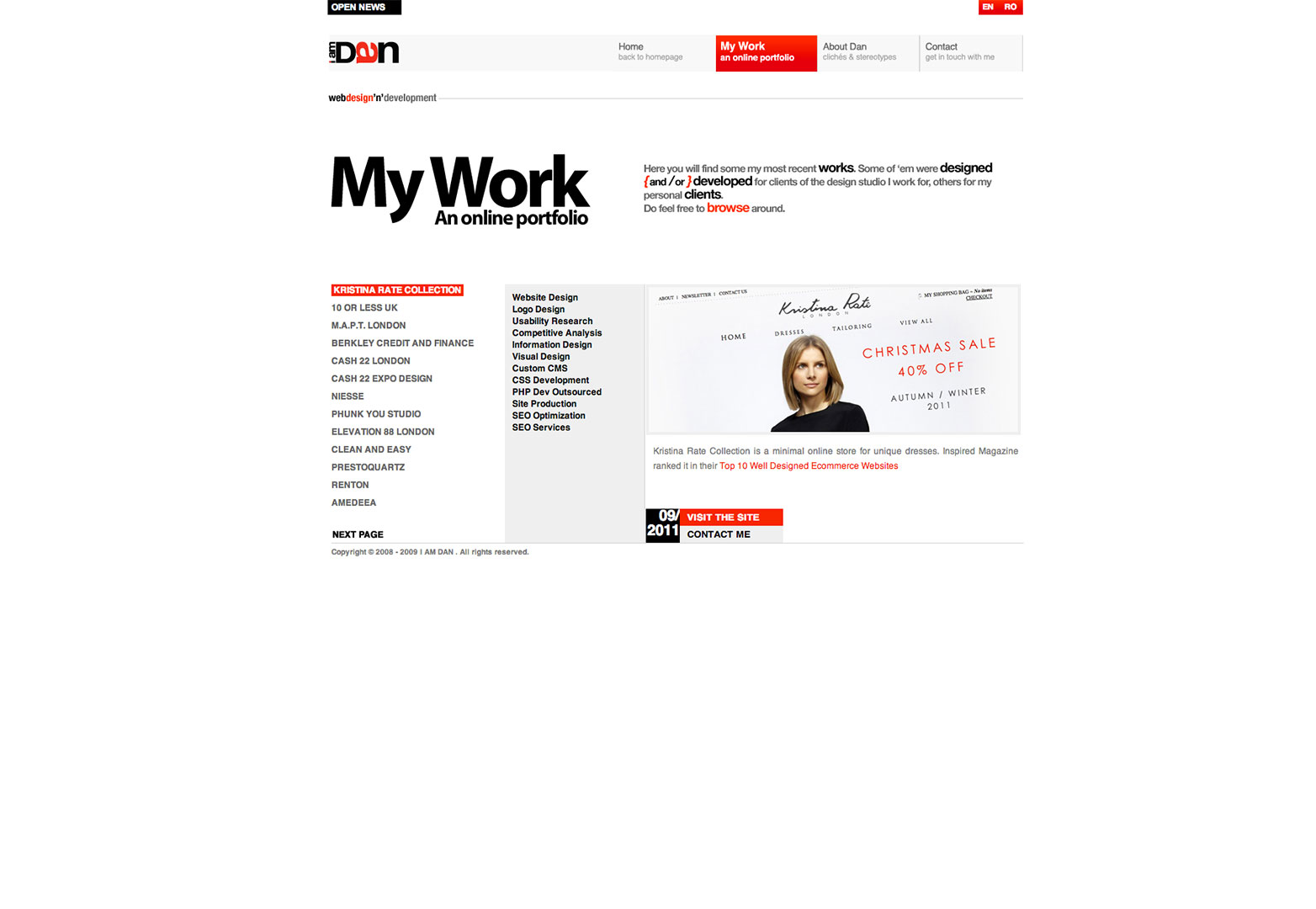 I Am Dan背后的設(shè)計(jì)師處理得非常棒,他在主頁(yè)上使用稀疏的色彩,成為了這個(gè)概念的典范。他的網(wǎng)站簡(jiǎn)直就是零星幾片紅色分割開(kāi)的留白。通過(guò)這種手段,紅色突顯了他作品集的鏈接,吸引訪客瀏覽他的站點(diǎn),有效地突出了他的網(wǎng)站,因此提高了訪客響應(yīng)召喚的幾率。