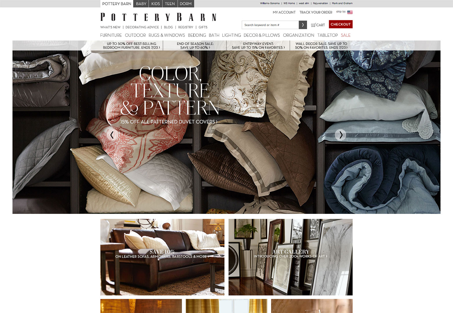 奢華的品牌了解這層隱喻,通常都使用更多留白來(lái)達(dá)到這一確切效果。PotteryBarn是個(gè)知名的高檔家具零售商,它的網(wǎng)站很聰明地使用了留白,恰恰反映了這一點(diǎn)。留白支配了主頁(yè),頁(yè)面旁邊大片的留白,更好地將訪問(wèn)者的注意力集中在頁(yè)面中間的交易與促銷(xiāo)信息上。甚至頁(yè)面頂部的品牌名稱(chēng)本身,也在字符之間慷慨地運(yùn)用了留白。