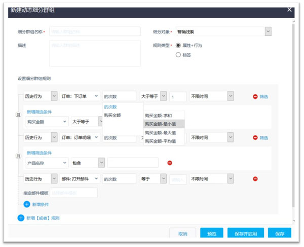 企業(yè)可以根據(jù)客戶屬性和行為或者客戶標(biāo)簽,創(chuàng)建更為精細(xì)化的細(xì)分群組。例如可以將客戶觸發(fā)行為設(shè)置為“客戶近半年購買過一次及一次以上產(chǎn)品”,同時(shí)設(shè)置產(chǎn)品類型和價(jià)格,通過更加詳細(xì)的細(xì)分群組規(guī)則,實(shí)現(xiàn)精準(zhǔn)人群定向投放。