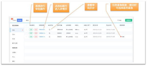 新版審批流,一站式解決審批困擾!除了可以直接進(jìn)行審批操作,還可以查看審批歷史,且歷史顯示信息更完整,包括加簽、轉(zhuǎn)辦、撤回、審批操作等。同時(shí),提交時(shí)就可以選擇緊急程度,便于上級(jí)領(lǐng)導(dǎo)及時(shí)查看,快速完成審批。