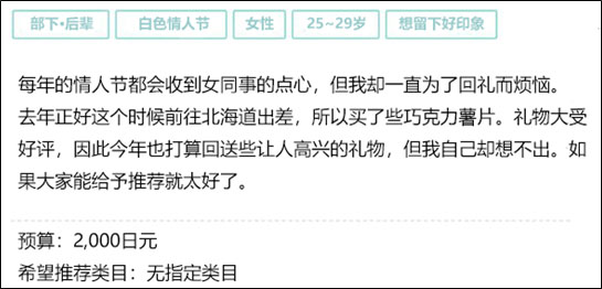 咨詢發(fā)布后,接下來只需要耐心等待來自其他用戶的禮物點(diǎn)子了。通過PitaPre給出建議的用戶8成都是女性,因此可以從接受方的角度請(qǐng)教“義理巧克力回禮”的問題。
