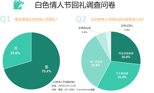事實(shí)上,有7成以上的男性為選擇白色情人節(jié)回禮而煩惱,更有調(diào)查結(jié)果顯示,對(duì)于自己選擇的禮物,超過半數(shù)的男性回答是“沒有自信”?!栋咨槿斯?jié)問卷調(diào)查(transcosmos調(diào)查)》