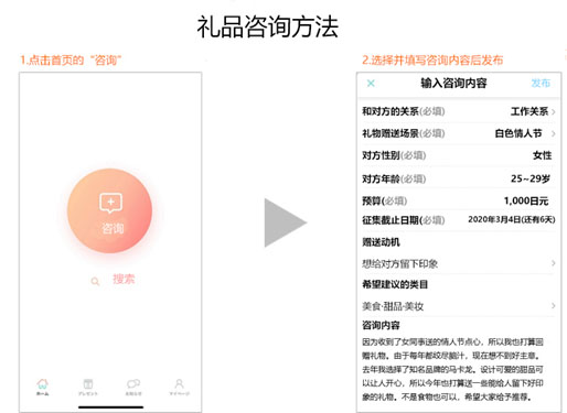 用戶選擇贈(zèng)送對(duì)象的屬性、關(guān)系、場(chǎng)景和預(yù)算后,只需填寫咨詢內(nèi)容即可發(fā)布。因此可以靈活地利用閑暇時(shí)間進(jìn)行簡(jiǎn)單咨詢。