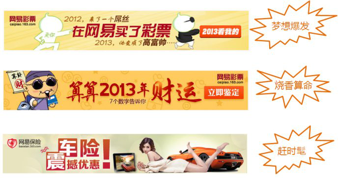 要做到大眾興趣和產(chǎn)品人群結(jié)合,其實(shí)就是找到產(chǎn)品的目標(biāo)人群對(duì)什么感興趣。去年做車險(xiǎn)素材時(shí),我們?cè)谔詫氈笖?shù)上查到,在汽車用品中最受歡迎的關(guān)鍵詞分別為”汽車、電子狗、汽車坐墊”,因此當(dāng)時(shí)網(wǎng)易保險(xiǎn)就出了一個(gè)”買車險(xiǎn)送電子狗”的素材(如下圖)。這個(gè)素材在當(dāng)月同樣位置的所有素材中,效果是最好的。