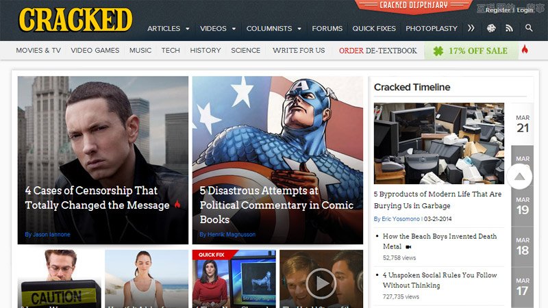 在三大因素齊備的前提下,你無需耗費太大力氣就能讓你的網(wǎng)站為你創(chuàng)造價值。以喜劇網(wǎng)站www.cracked.com為例,這網(wǎng)站一直是以其幽默和富有爭議的內(nèi)容而著稱,它借助合理的設(shè)計和營銷,在同類網(wǎng)站中脫穎而出。