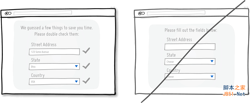 在表單字段中預先填寫合理的默認值,這是一種幫助用戶盡快完成表單填寫的常見方式。最差勁的體驗之一,就是用戶曾經(jīng)填寫過某些數(shù)據(jù),而你還要他們重復這些動作。使用經(jīng)過調(diào)研驗證的恰當數(shù)據(jù),或是曾經(jīng)保存過的用戶輸入內(nèi)容作為表單字段的默認值,讓用戶少做些事情,多些輕松。